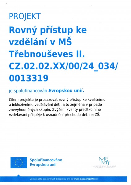 Naše jednotřídní mateřská škola je rodinného typu, má kapacitu 25 dětí a sídlí v obci Třebnouševes, nedaleko Hořic. Školička je přízemní budova, kde je vše účelně a útulně zařízeno. Máme samostatnou ložnici, která dopoledne slouží na pohybové aktivity. MŠ je umístěna v hezkém prostředí, v blízkosti polí a luk. Do školky, kde vládne pohoda a úsměv docházejí děti z Třebnouševse, z Ostrova, Milovic a Hořic. Ve věkově smíšené třídě je přirozeně dosahováno prosociálního chování – starší pomáhají mladším. Vedeme děti ke zdravému životnímu stylu a ochraně životního prostředí. Snažíme se o individuální přístup ke každému dítěti. Naším cílem je, aby se děti ve školce cítily bezpečně a prožily u nás část spokojeného dětství.